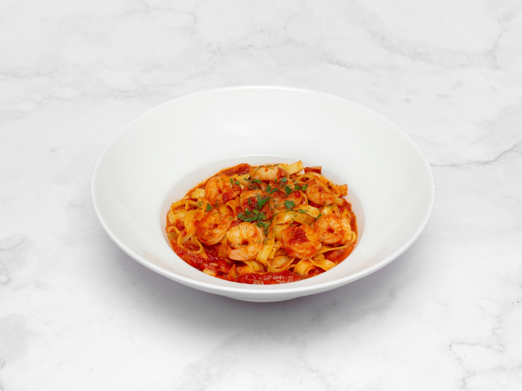 krewetki (10 szt.), czosnek, sos pomidorowy, białe wino, masło, pietruszka