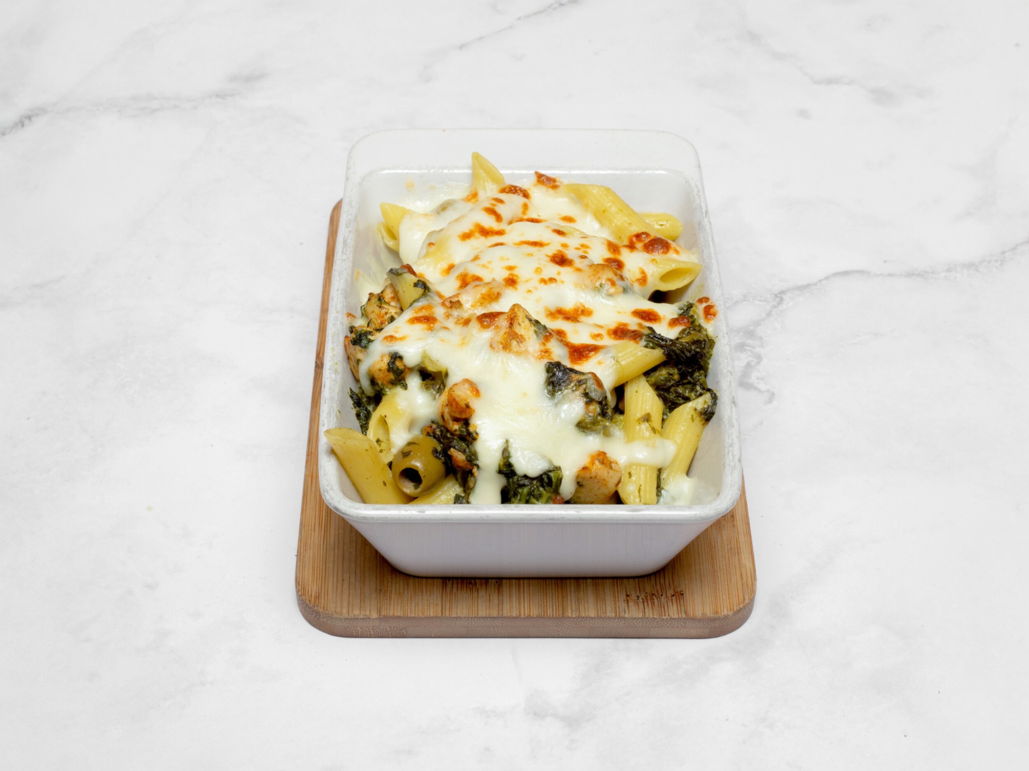 makaron penne ze szpinakiem, kawałkami kurczaka, serem feta i oliwkami, zapiekany pod serem mozzarella