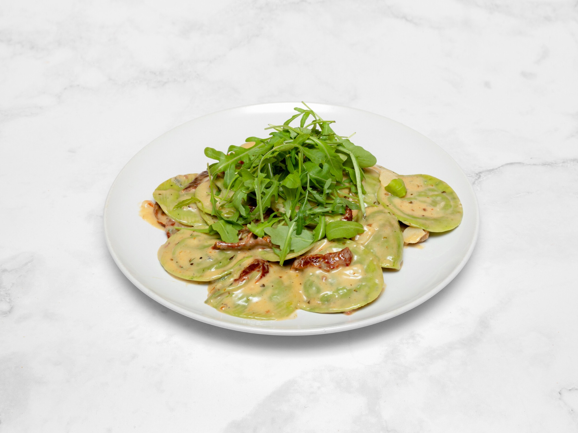 ravioli z nadzieniem szpinakowym, podawane w sosie z gorgonzoli z suszonymi pomidorami i rukolą