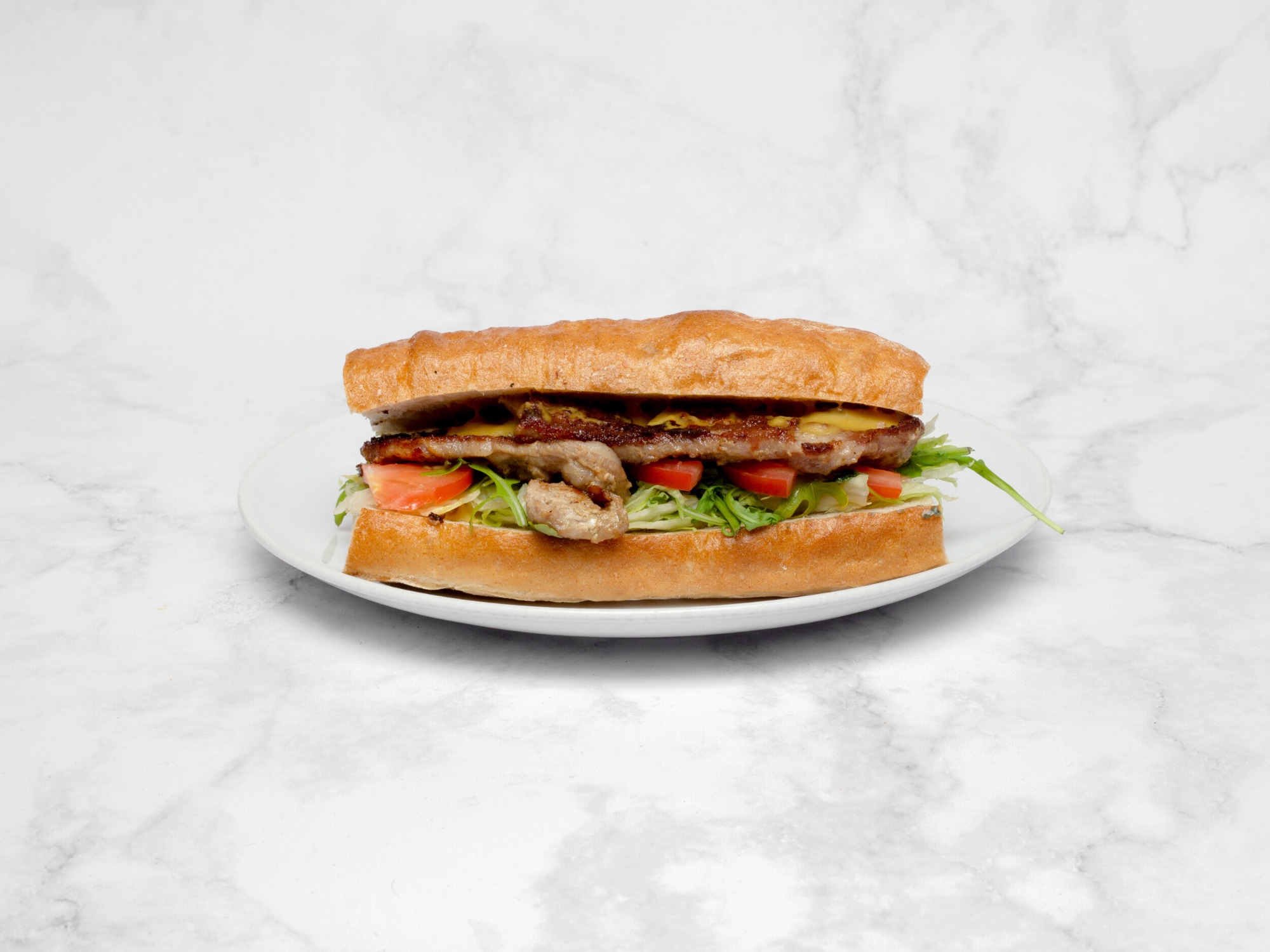 bagietka wiejska, grillowana karkówka, pomidor, rukola, sałata lodowa, sos musztardowo - miodowy