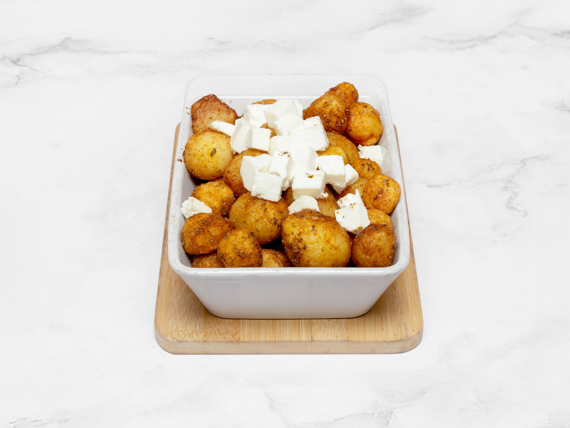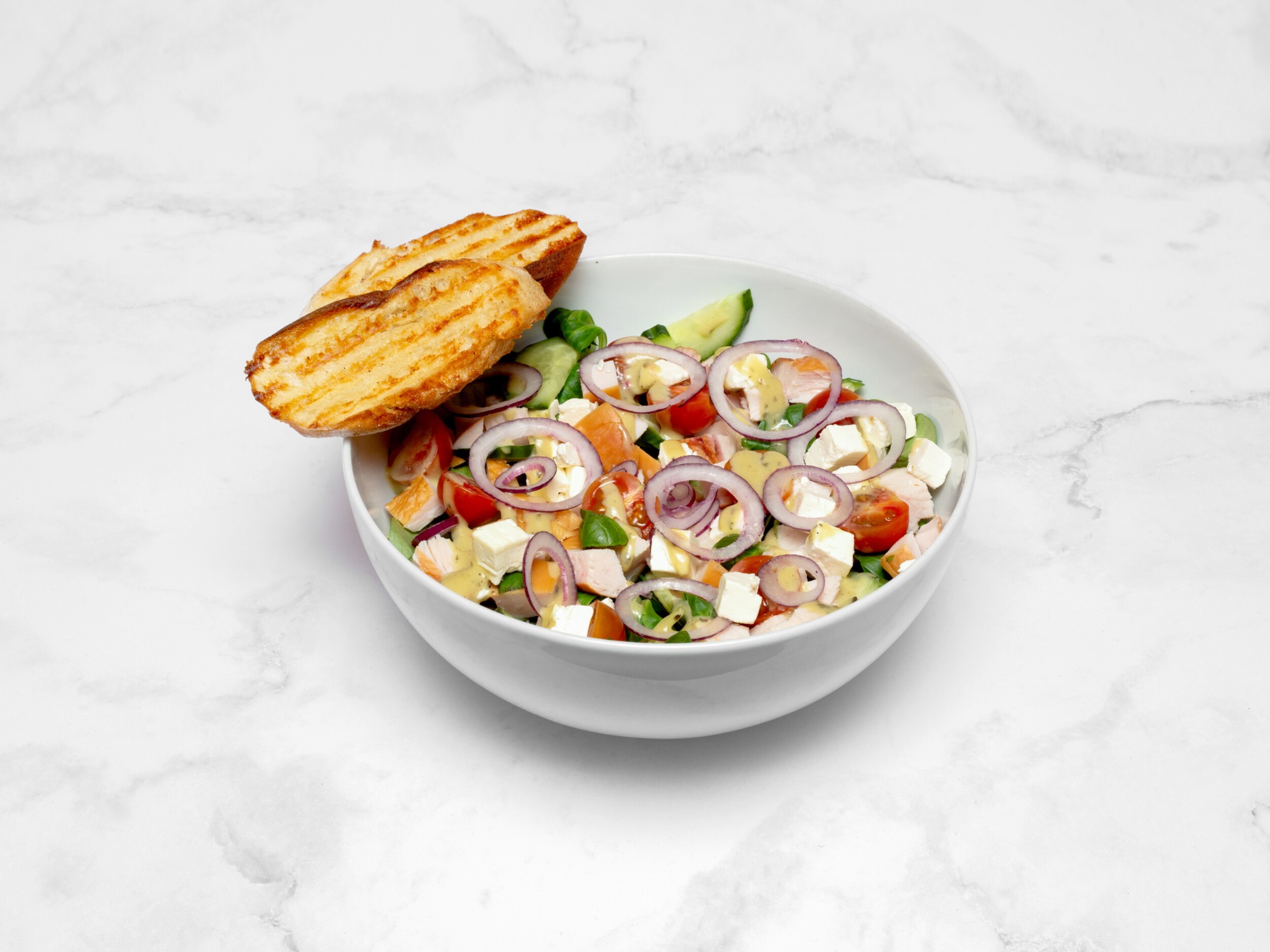 mieszanka sałat z sosem vinegret, pomidor, ogórek, papryka, pierś z kurczaka, ser feta, oliwki, sos czosnkowy
