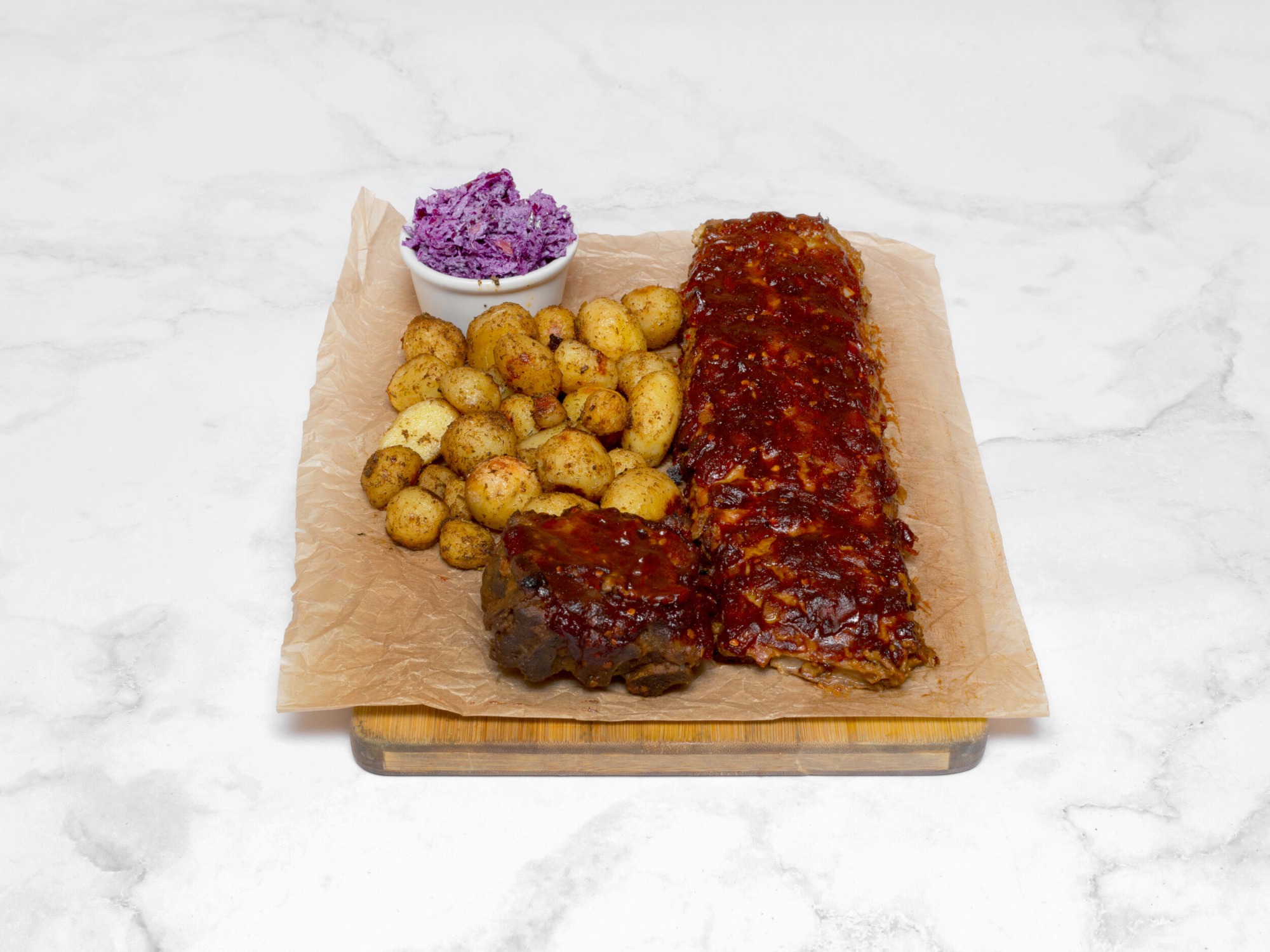 żeberka w sosie musztardowym, piklowany świeży ogórek, czerwona cebula, roszponka, sos biały