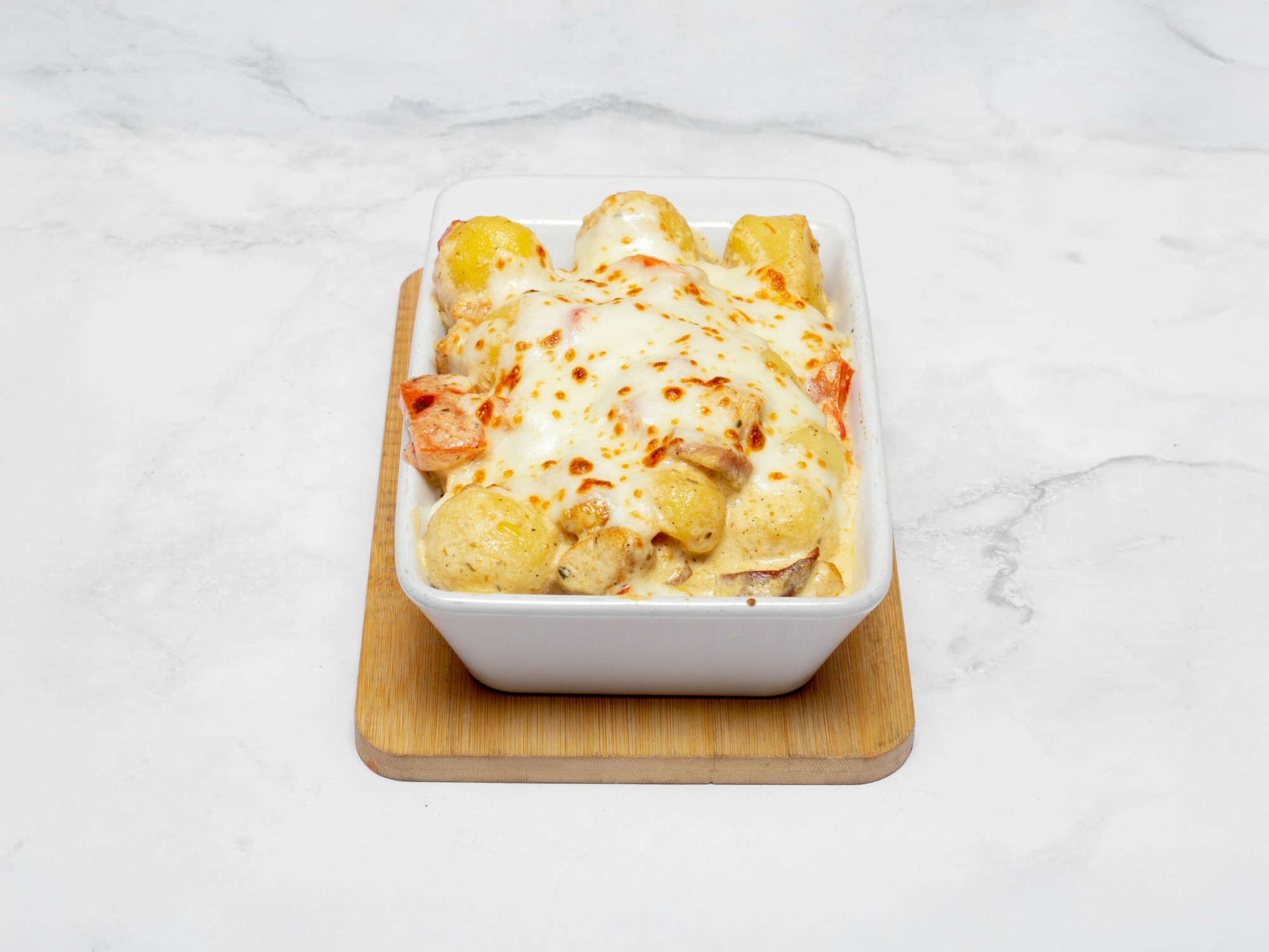 ziemniaki w sosie śmietanowym z boczkiem, kawałkami kurczaka, pomidorem i papryką zapiekane pod serem
