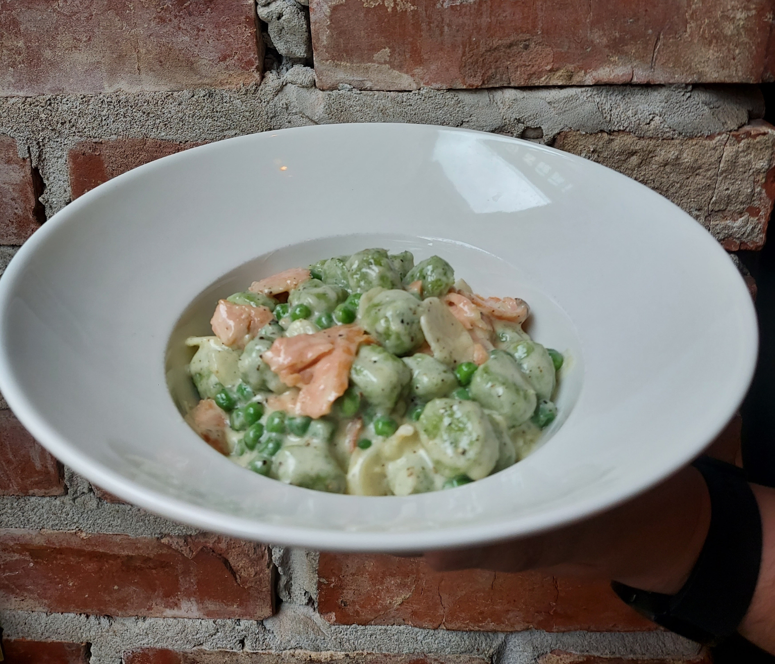 Gnocchi pietruszkowe, sos śmietanowy, łosoś wędzony MOWI, świeży groszek, czosnek