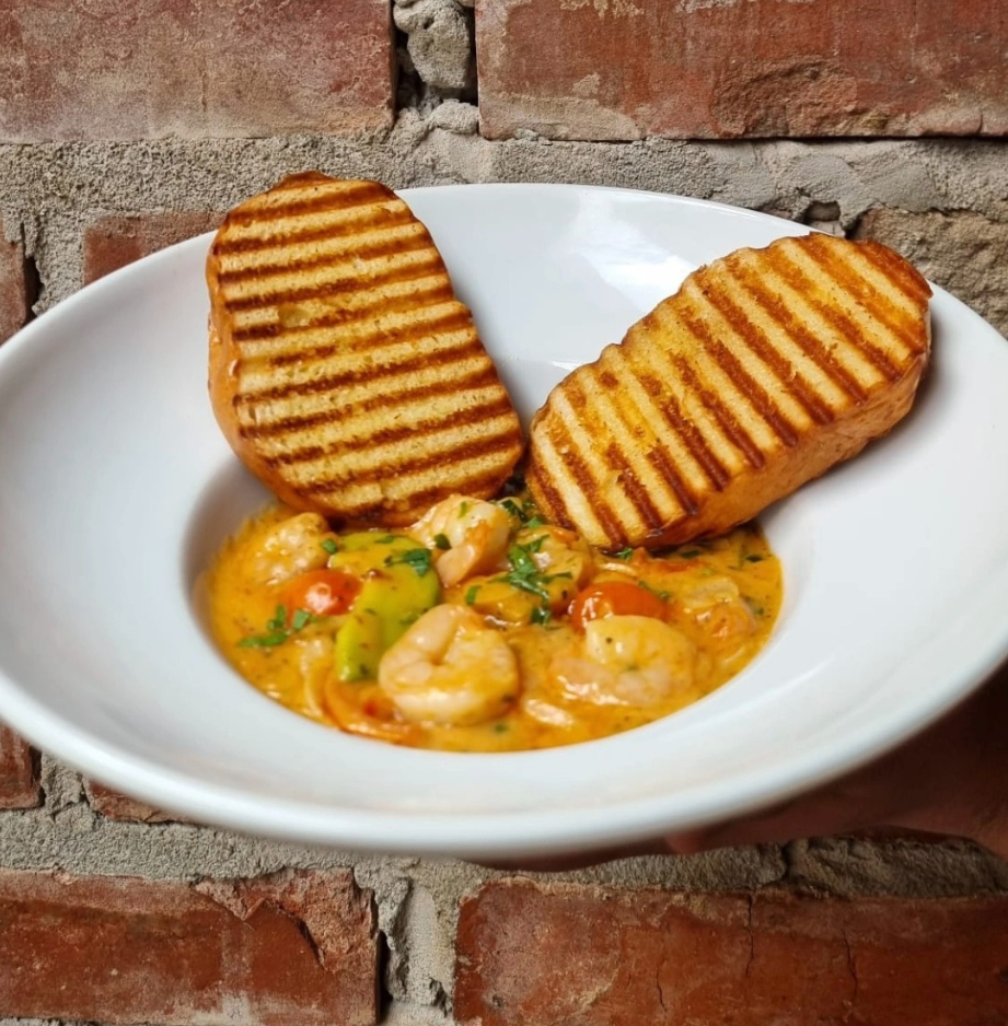 Krewetki (16szt.), pomidorki koktajlowe, czosnek, avocado, śmietanka, masło, pietruszka. Podawane z grzankami maślanymi.